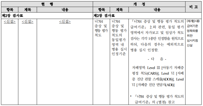 | 신설 | 너701 증상 및 행동 평가척도의 동일평가영역 내 병용 실시 인정기준 | 급여기준 명확화를 위한 지침 신설 |
