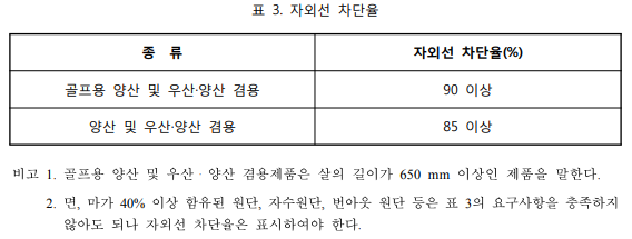 | 양산 자외선 차단 표준 1. (살 길이 650mm 미만) 양산 및 우산 양산 겸용은 자외선 차단율 85% 이상 2. (살 길이 650mm 이상) 양산 및 우산 양산 겸용은 자외선 차단율 90% 이상 |